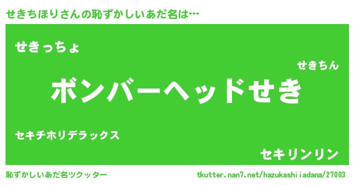 | ヘコむあだ名 | 『酢こんぶ』『せきを』『せきふぇ~』 |