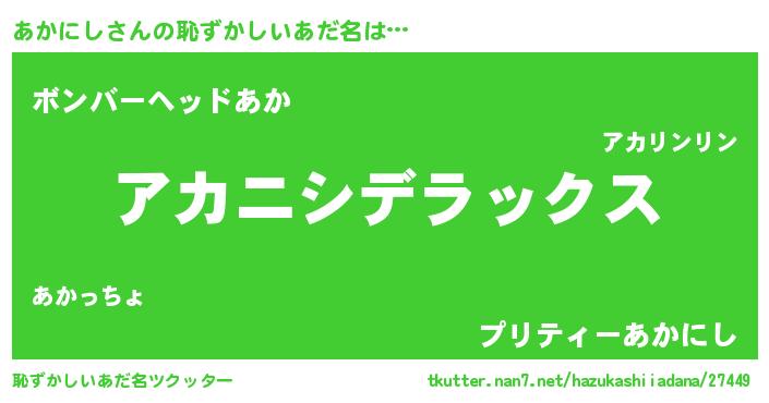 | 男性向けラノベタイトル風あだ名 | 『Re:あかにしから始める異世界生活』 |