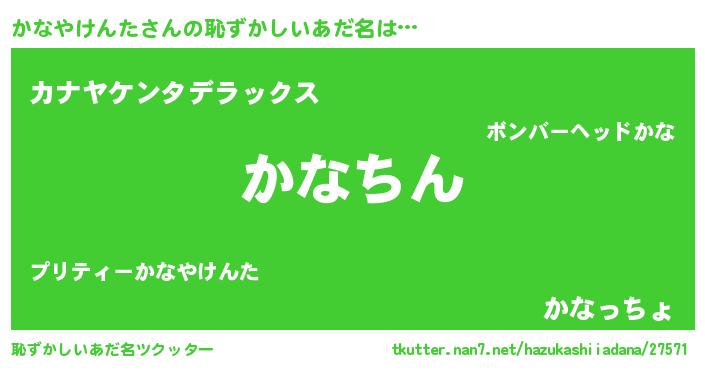 | 男性向けラノベタイトル風あだ名 | 『魔弾の王とかなやけんた』 |