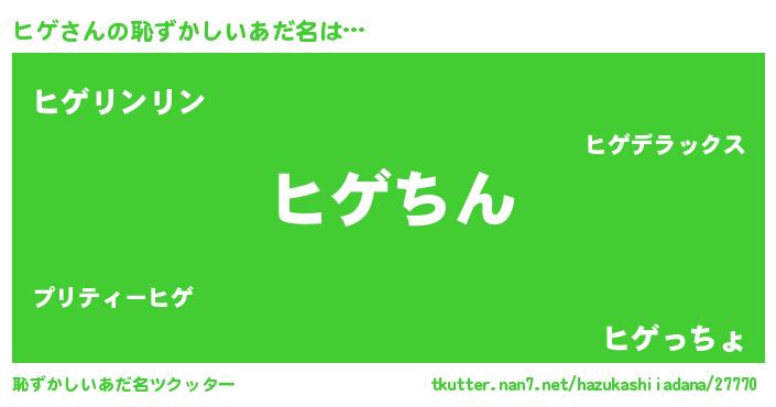 ヒゲさんの恥ずかしいあだ名は… 『ヒゲちん』『ヒゲリンリン』『ヒゲっちょ』 ツクッター #恥ずかしいあだ名ツクッター http://tkutter.nan7.net/hazukashiiadana/27770/