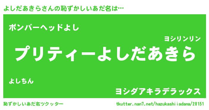 | ヒーロー風カッコイイあだ名 | 『スーパーヨシダアキラ』『仮面ヨシダー』 |