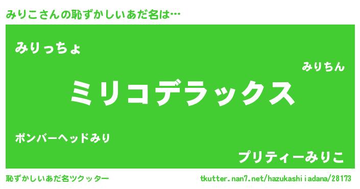 | 男性向けラノベタイトル風あだ名 | 『ミリコスレイヤー』『魔弾の王とみりこ』 |