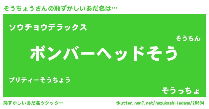 そうちょうさんの恥ずかしいあだ名は… 『ボンバーヘッドそう』『ソウチョウデラックス』『そうっちょ』 ツクッター #恥ずかしいあだ名ツクッター http://tkutter.nan7.net/hazukashiiadana/28694/