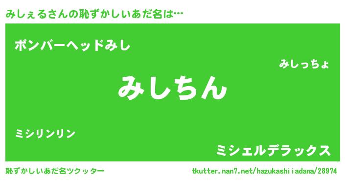 | 胡散臭い通販商品みたいなあだ名 | 『絶対に幸福をもたらす水素水…その名も「みしぇる」』 |