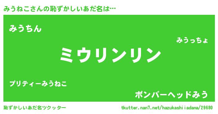 | 男性向けラノベタイトル風あだ名 | 『ダンジョンにみうねこを求めるのは間違っているだろうか』 |