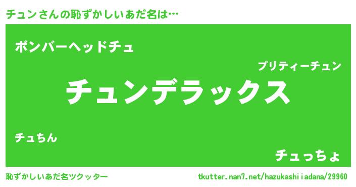 | ヒーロー風カッコイイあだ名 | 『仮面チュダー』『究極戦士チュン』 |