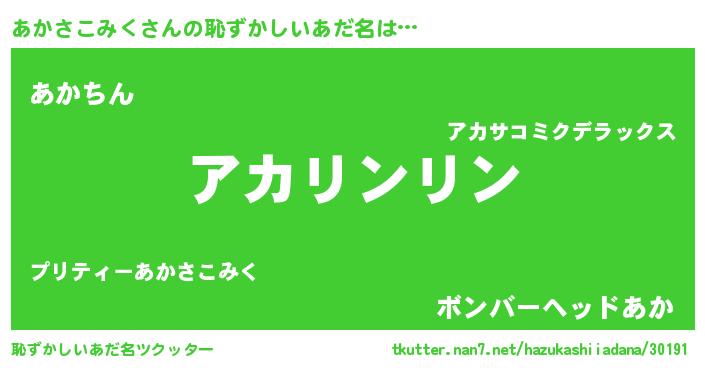 | ヘコむあだ名 | 『あかっぺ』『あかさこみく(笑)』 |