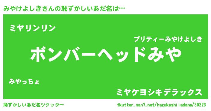 | ヘコむあだ名 | 『みや太郎』『みやにー』『酢こんぶ』 |