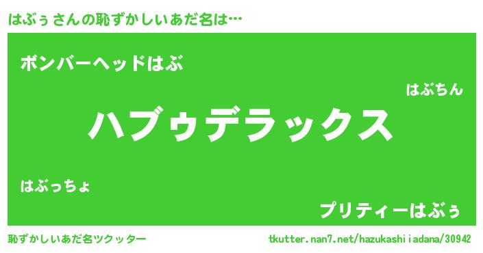 はぶぅさんの恥ずかしいあだ名は… 『ハブゥデラックス』『ボンバーヘッドはぶ』『プリティーはぶぅ』 ツクッター #恥ずかしいあだ名ツクッター http://tkutter.nan7.net/hazukashiiadana/30942/