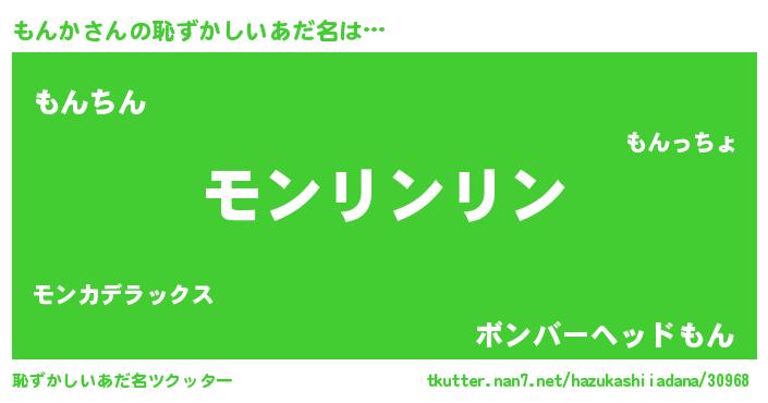 | 男性向けラノベタイトル風あだ名 | 『もんかの嫁は女の子じゃないと思った?』 |