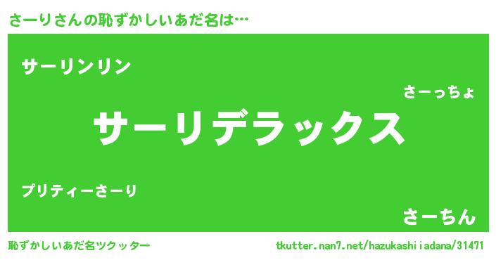| 男性向けラノベタイトル風あだ名 | 『Re:さーりから始める異世界生活』 |