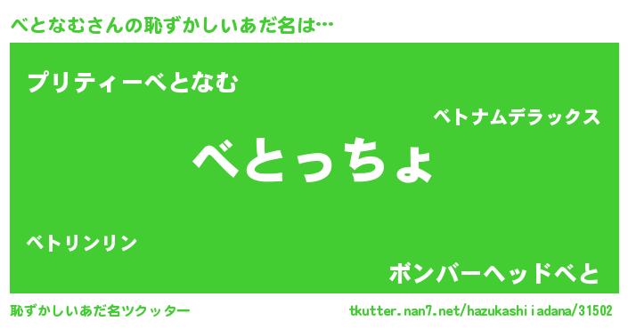 | ヒーロー風カッコイイあだ名 | 『仮面ベトダー』『ウルトラべとなむマン』 |