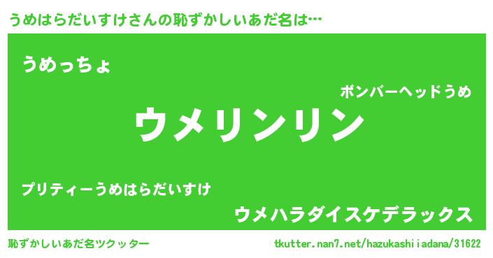 | 男性向けラノベタイトル風あだ名 | 『ダンジョンにうめはらだいすけを求めるのは間違っているだろうか』 |