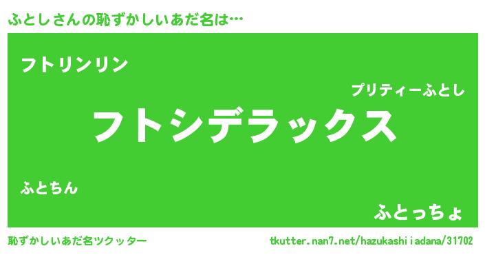 ふとしさんの恥ずかしいあだ名は… 『フトシデラックス』『フトリンリン』『ふとっちょ』 ツクッター #恥ずかしいあだ名ツクッター http://tkutter.nan7.net/hazukashiiadana/31702/