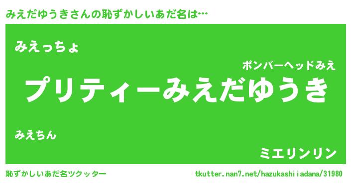 | ヒーロー風カッコイイあだ名 | 『スーパーミエダユウキ』『炎刃騎士ミエ』 |