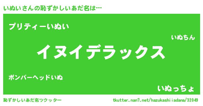 | 男性向けラノベタイトル風あだ名 | 『Re:いぬいから始める異世界生活』 |