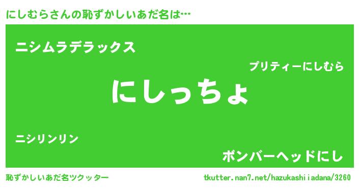 | 意味不明あだ名 | 『にしむらフォーエバー』『自称にしむら』 |