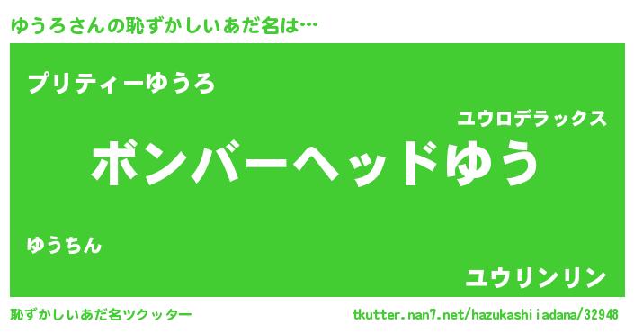 | 男性向けラノベタイトル風あだ名 | 『ゆうろ~年齢イコール彼女いない歴の魔法使い~』 |