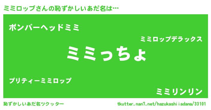 | 男性向けラノベタイトル風あだ名 | 『ミミロップ~年齢イコール彼女いない歴の魔法使い~』 |