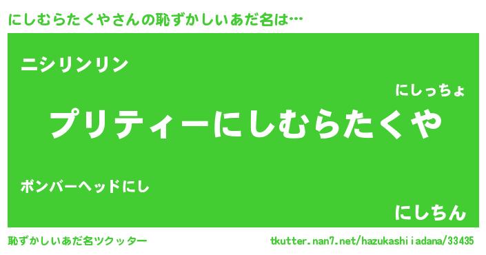 | ポケモン風あだ名 | 『ニシチュウ』『ヒニシムラタクヤ』 |