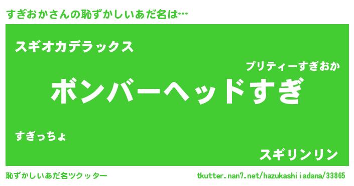 | 男性向けラノベタイトル風あだ名 | 『転生したらすぎおかだった件』 |