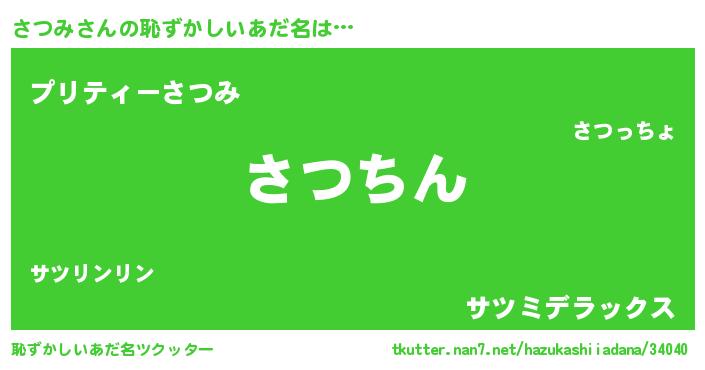 | 男性向けラノベタイトル風あだ名 | 『さつみ~年齢イコール彼女いない歴の魔法使い~』 |