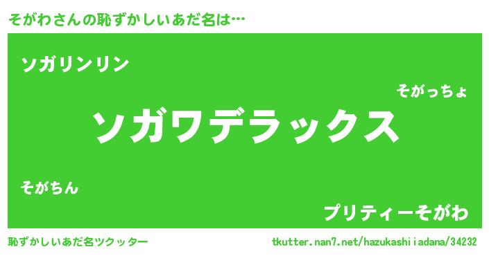 | 男性向けラノベタイトル風あだ名 | 『Re:そがわから始める異世界生活』 |