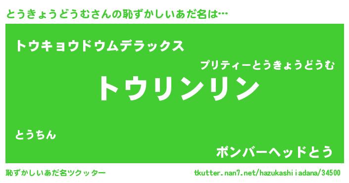 | 意味不明あだ名 | 『とにかく怪しいとうきょうどうむ』 |