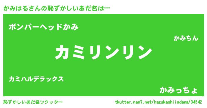 | 男性向けラノベタイトル風あだ名 | 『かみはるの嫁は女の子じゃないと思った?』 |
