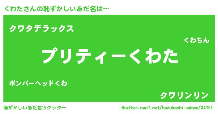 | 男性向けラノベタイトル風あだ名 | 『この素晴らしい世界にくわたを!』 |