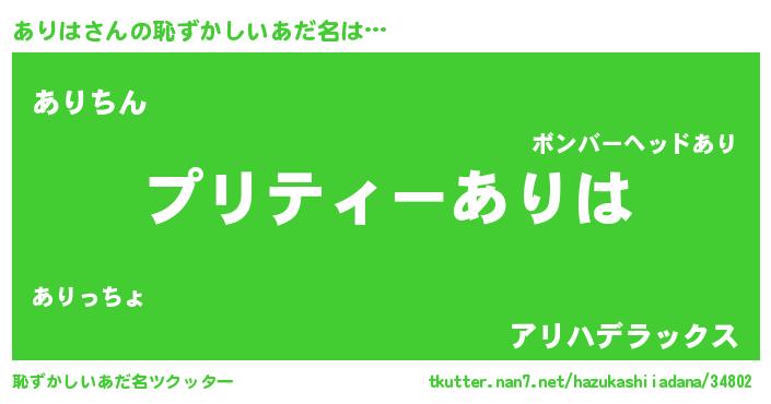 | 意味不明あだ名 | 『ペロリンありは』『永久保存ありは』 |