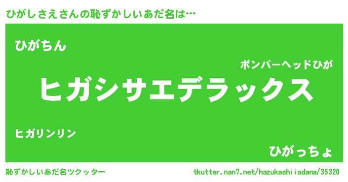 | 男性向けラノベタイトル風あだ名 | 『Re:ひがしさえから始める異世界生活』 |