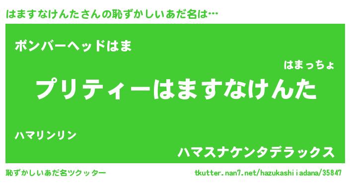 | 男性向けラノベタイトル風あだ名 | 『はますなけんた~年齢イコール彼女いない歴の魔法使い~』 |