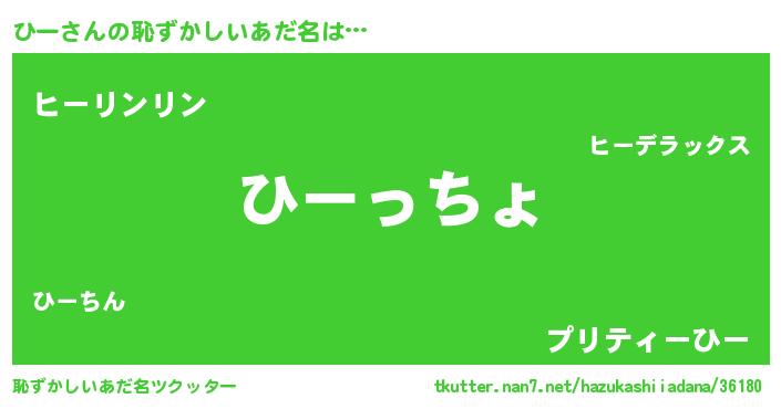 ひーさんの恥ずかしいあだ名は… 『ひーっちょ』『ヒーリンリン』『プリティーひー』 ツクッター #恥ずかしいあだ名ツクッター http://tkutter.nan7.net/hazukashiiadana/36180/