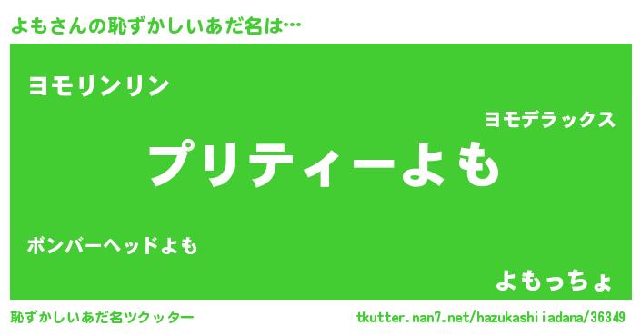 よもさんの恥ずかしいあだ名は… 『プリティーよも』『ヨモリンリン』『よもっちょ』 ツクッター #恥ずかしいあだ名ツクッター http://tkutter.nan7.net/hazukashiiadana/36349/