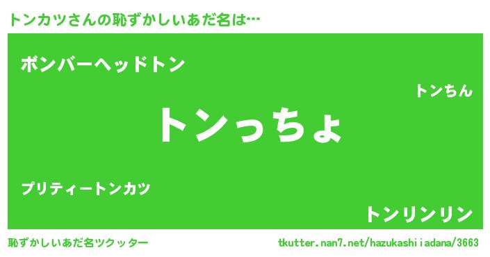 トンカツさんの恥ずかしいあだ名は… 『トンっちょ』『ボンバーヘッドトン』『トンリンリン』 ツクッター #恥ずかしいあだ名ツクッター http://tkutter.nan7.net/hazukashiiadana/3663/