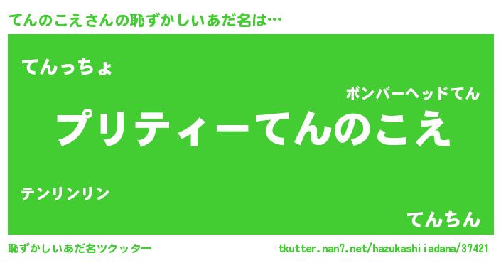 てんのこえさんの恥ずかしいあだ名は… 『プリティーてんのこえ』『てんっちょ』『てんちん』 ツクッター #恥ずかしいあだ名ツクッター http://tkutter.nan7.net/hazukashiiadana/37421/