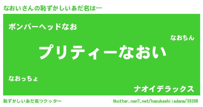 なおいさんの恥ずかしいあだ名は… 『プリティーなおい』『ボンバーヘッドなお』『ナオイデラックス』 ツクッター #恥ずかしいあだ名ツクッター http://tkutter.nan7.net/hazukashiiadana/38308/