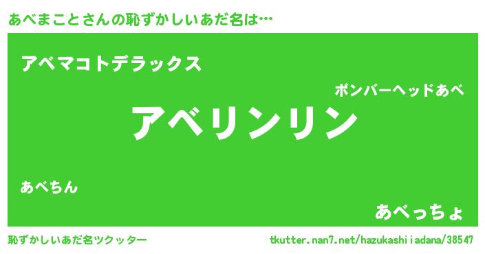 | 男性向けラノベタイトル風あだ名 | 『うちのあべまことが世界を掌握している!』 |