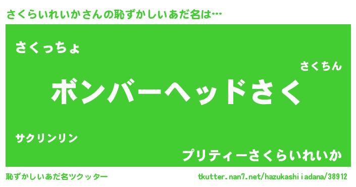 さくらいれいかさんの恥ずかしいあだ名は… 『ボンバーヘッドさく』『さくっちょ』『プリティーさくらいれいか』 ツクッター #恥ずかしいあだ名ツクッター http://tkutter.nan7.net/hazukashiiadana/38912/