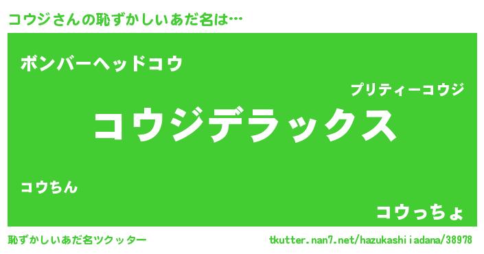 コウジさんの恥ずかしいあだ名は… 『コウジデラックス』『ボンバーヘッドコウ』『コウっちょ』 ツクッター #恥ずかしいあだ名ツクッター http://tkutter.nan7.net/hazukashiiadana/38978/