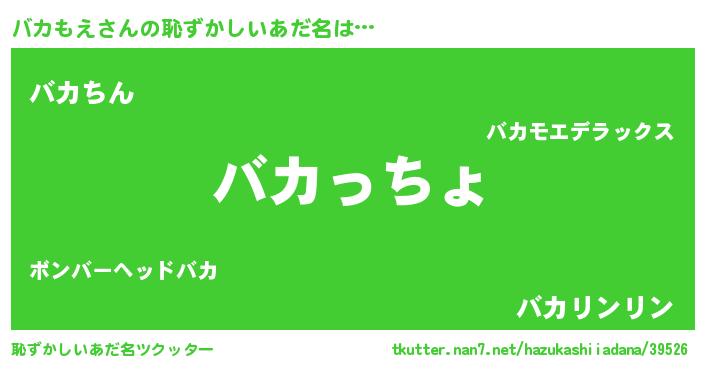 バカもえさんの恥ずかしいあだ名は… 『バカっちょ』『バカちん』『バカリンリン』 ツクッター #恥ずかしいあだ名ツクッター http://tkutter.nan7.net/hazukashiiadana/39526/