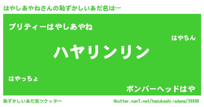 | 欧米人風あだ名 | 『ウサインはやしあやね』 |