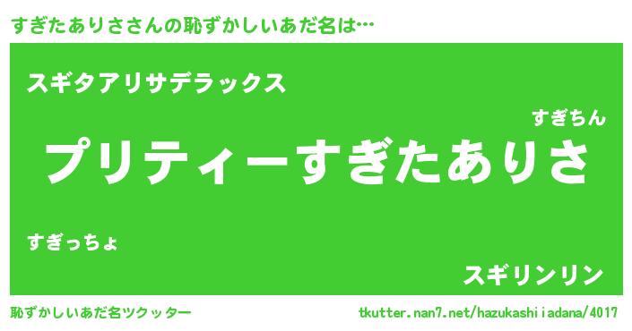 | 男性向けラノベタイトル風あだ名 | 『スギタアリサアートオンライン』 |