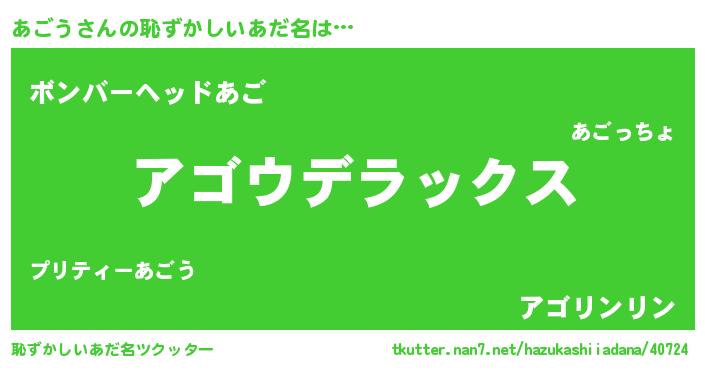 | 男性向けラノベタイトル風あだ名 | 『Re:あごうから始める異世界生活』 |