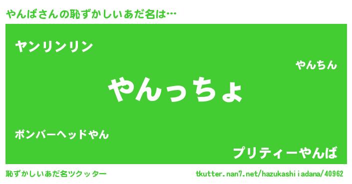 やんばさんの恥ずかしいあだ名は… 『やんっちょ』『ヤンリンリン』『プリティーやんば』 ツクッター #恥ずかしいあだ名ツクッター http://tkutter.nan7.net/hazukashiiadana/40962/