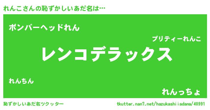 | 男性向けラノベタイトル風あだ名 | 『Re:れんこから始める異世界生活』 |