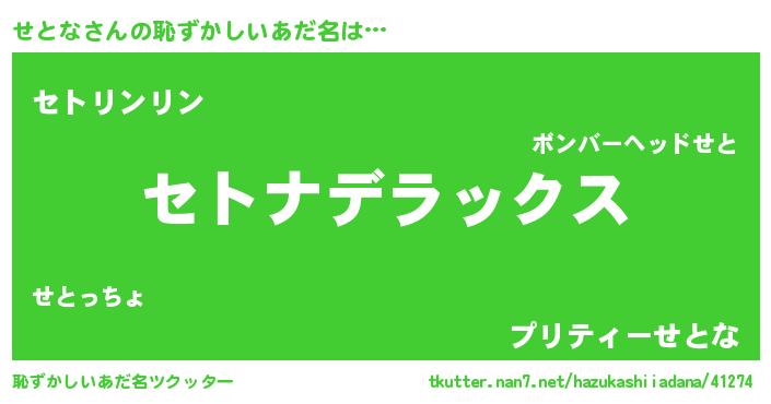 | 男性向けラノベタイトル風あだ名 | 『セトナスレイヤー』 |