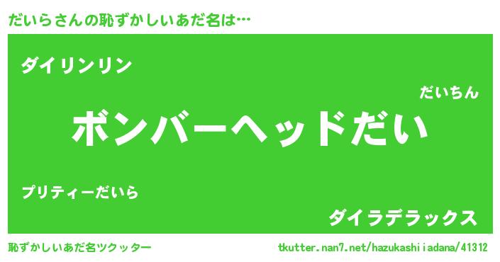 | ヘコむあだ名 | 『だいぷりん』『だいら(爆)』『豆乳』 |
