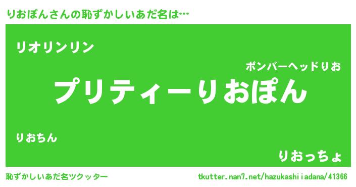 りおぽんさんの恥ずかしいあだ名は… 『プリティーりおぽん』『リオリンリン』『りおっちょ』 ツクッター #恥ずかしいあだ名ツクッター http://tkutter.nan7.net/hazukashiiadana/41366/